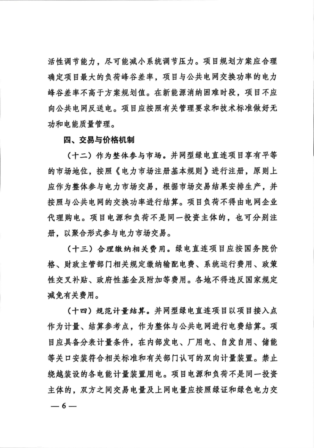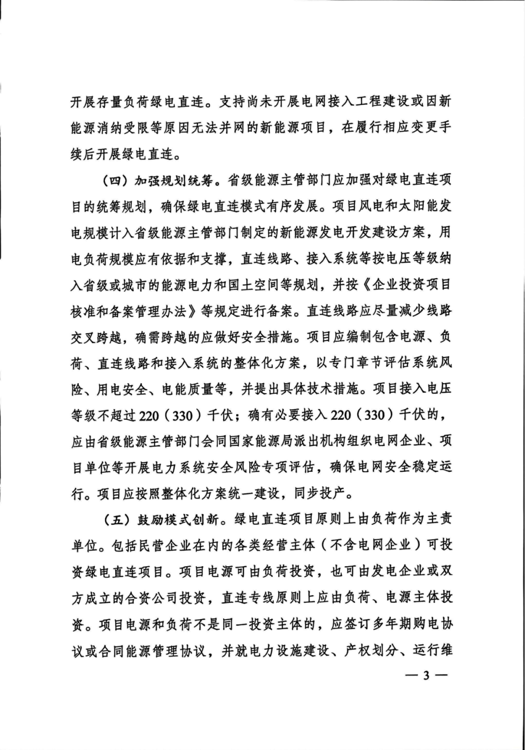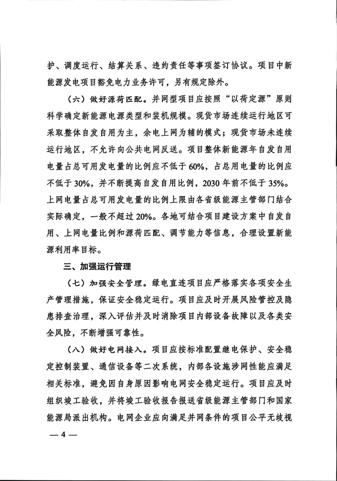 《通知》明确,绿电直连是指风电、太阳能发电、生物质发电等新能源不直接接入公共电网,通过直连线路向单一电力用户供给绿电,可实现供给电量清晰物理溯源的模式。国家能源局有关负责同志表示,一方面绿电直连模式可满足新能源就近消纳需要、满足用户绿电消费需求,另一方面还能为用户降低用电成本提供更多选择。在促进新能源就近消纳、推动能源转型方面,《通知》明确自发自用电量比例,奠定项目“绿”的基础,要求项目新能源年自发自用电量占总发电量的比例不低于60%,占总用电量的比例由2025年不低于30%逐年提升至2030年不低于35%,引导新能源项目尽可能就近就地消纳利用,确保项目“绿”的底色。挖掘灵活调节潜力,提升项目“绿”的能力,引导绿电直连项目通过合理配置储能、挖掘用户灵活调节潜力等方式,提升新能源自发自用比例,让项目更“绿”。为保证大电网安全稳定运行,《通知》明确,大电网与绿电直连项目按责任界面各自履行相应的安全保供责任,并从规划、并网和运行等环节对绿电直连项目提出要求,优先保障大电网运行安全。在市场交易和价格机制方面,绿电直连项目作为整体参与市场。按照《通知》,并网型绿电直连项目享有平等的市场地位,按照《电力市场注册基本规则》进行注册,原则上应作为整体参与电力市场交易,根据市场交易结果安排生产,并按照与公共电网的交换功率进行结算。项目负荷不得由电网企业代理购电。项目电源和负荷不是同一投资主体的,也可分别注册,以聚合形式参与电力市场交易。